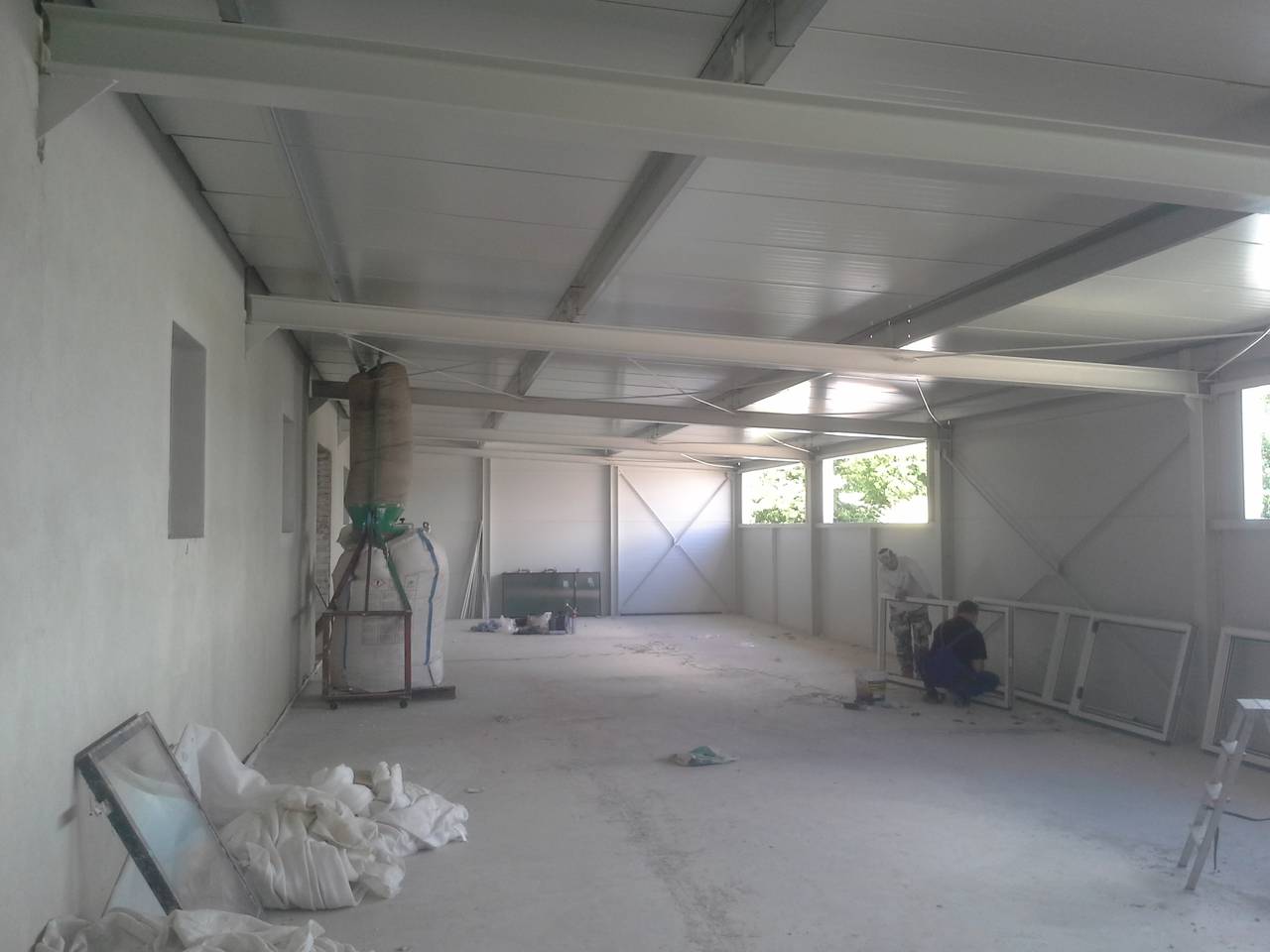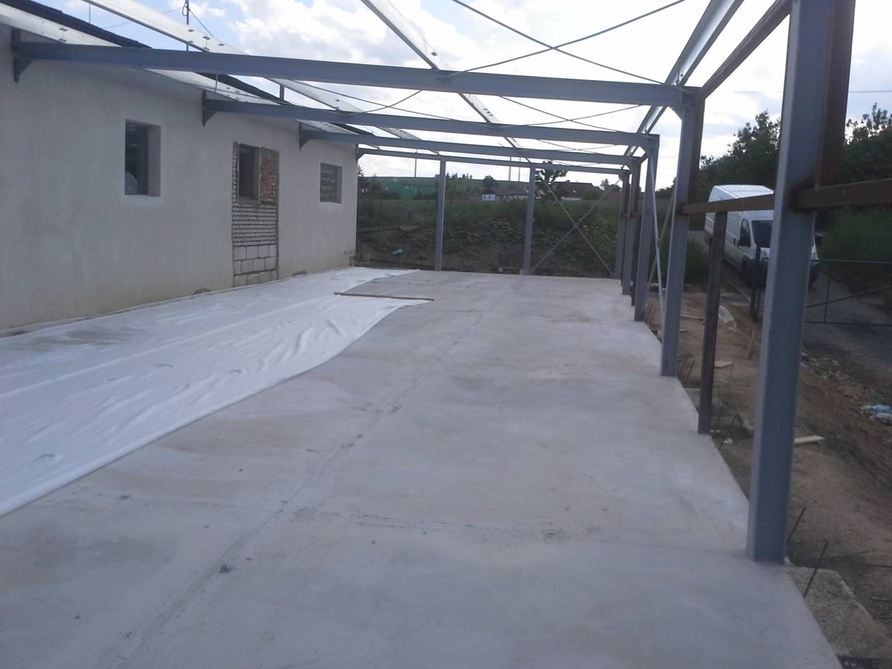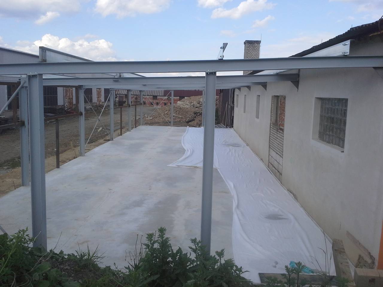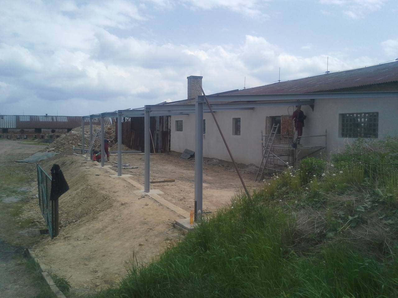 Přístavba jednolodní skladovací haly 7,5 x 25 m, ocelová nosná konstrukce. Dodávka nosné konstrukce, opláštění a podlahové desky.